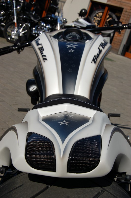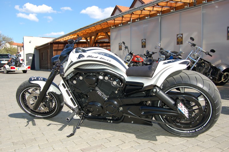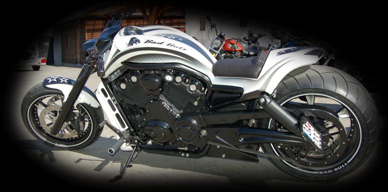 BadBull : Motocykl v moderním sportovním stylu. Brutální design spojený s nejnovějšími technologiemi v moderním strohém pojetí. Stroj vychází z konstrukce V-Rod. Motocykl byl od základu změněn a z původního V-Roda zůstal pouze motor a rám, jinak bylo vše změněno. Kapotáž motocyklu rovněž není sériová, ale je z regálů Thunder Bike, který byl nalakován do matného laku v bílé barvě s motivem dle majitele. Zadní kyvná vidlice byla změněna pro umístnění 300mm kola. Proto tato vidlice musela být v polovině rozříznuta a rozšířena na požadovaný rozměr. Na motoru je instalován Engine Glass což je prosklená a podsvícená hadice od vodní pumpy ve které je vidět jak za chodu v motoru koluje chladící kapalina. Elektroinstalace, řidítka, kola atd. nemají s originálem nic společného. Motocykl je absolutní originál, který je podpořen silným a vyladěným motorem.